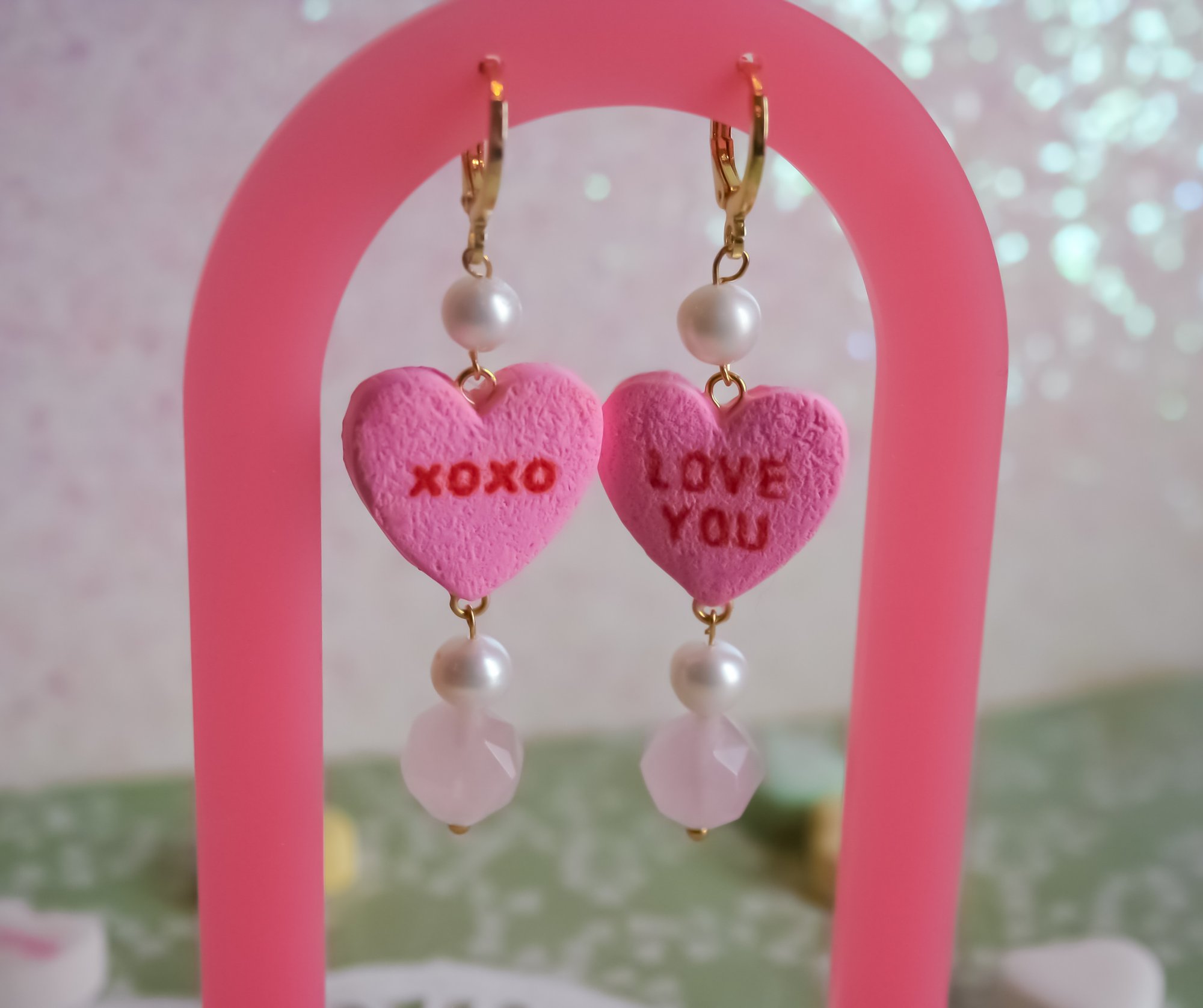 Made with polymer clay, freshwater pearl beads, and rose quartz beads. These are made to order so please be aware of slight differences. The candy heart is matte and textured but if you’d prefer glossy please let me know in your notes!